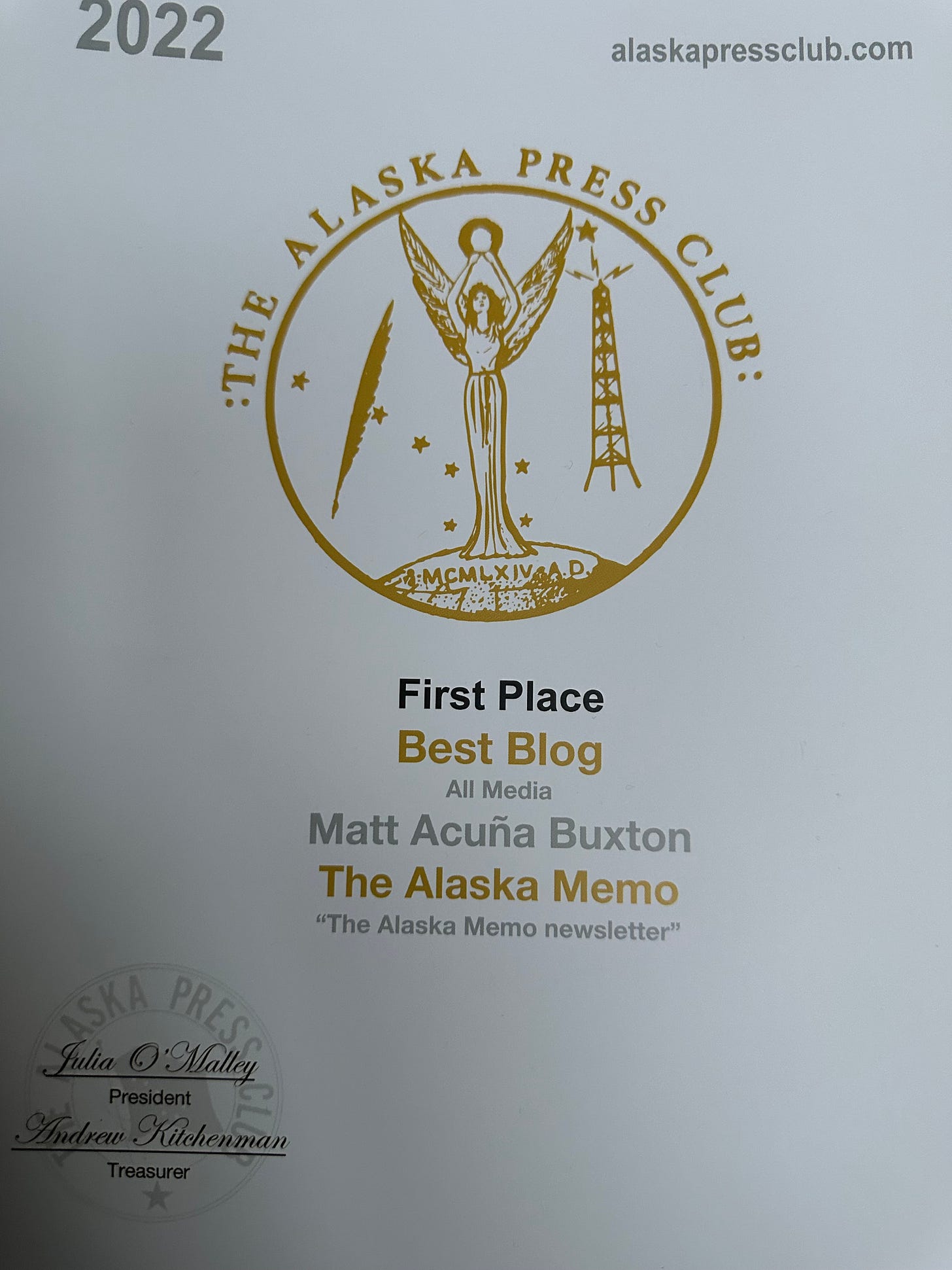 And, congratulations to Matt for his recent win of Best Blog by the Alaska Press Club! You can subscribe to his award-winning newsletter here.
