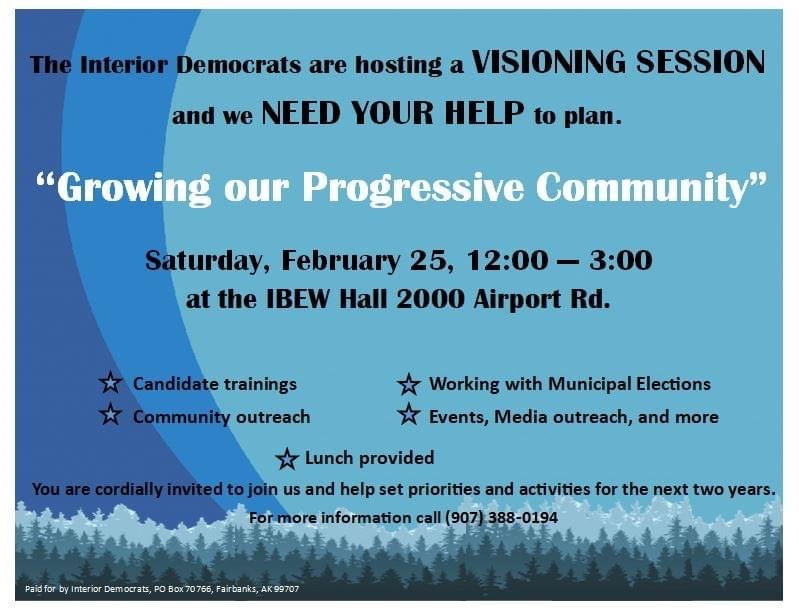 If you’re looking to help get progressive candidates elected (you should be!) in any capacity next year, the Interior Dems are having a visioning session this Saturday, February 25, from noon to three.