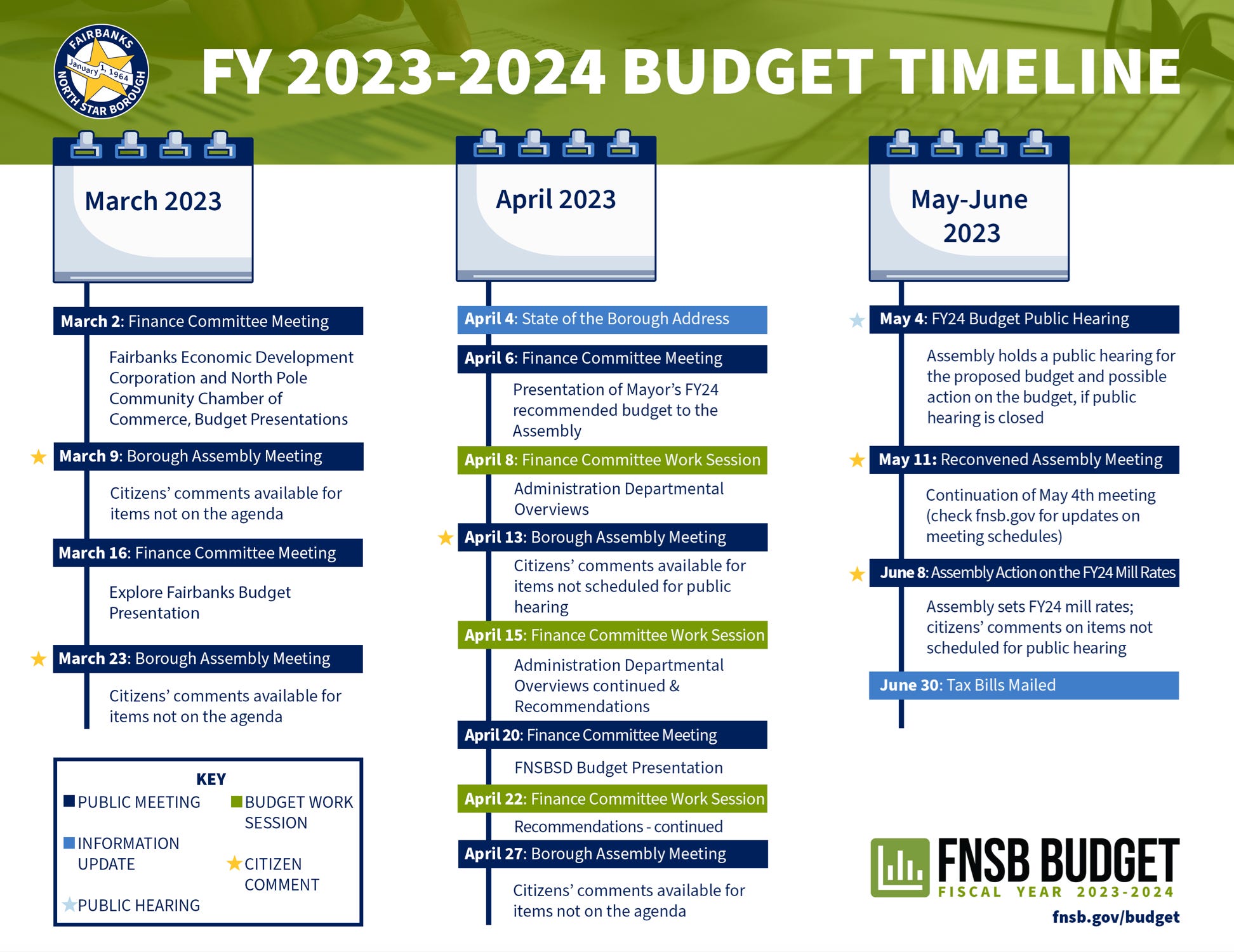 Well, the FNSB actually has this handy document that explains this years timeline… long story short, the mayors budget is a well-polished draft. Much can change based on the will of the Assembly (and, hopefully, borough residents).