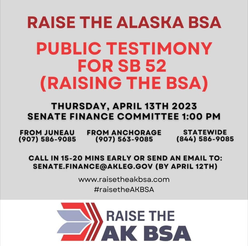 As I’ve written about before, it’s time to increase the Base Student Allocation (BSA), the primary funding mechanism for Alaskan public schools. You have a chance to testify in front of the State Senate Finance Committee tomorrow, April 13 at 1:00pm. You can also send them testimony via email, preferably by the end of the day today, Wednesday, April 12.